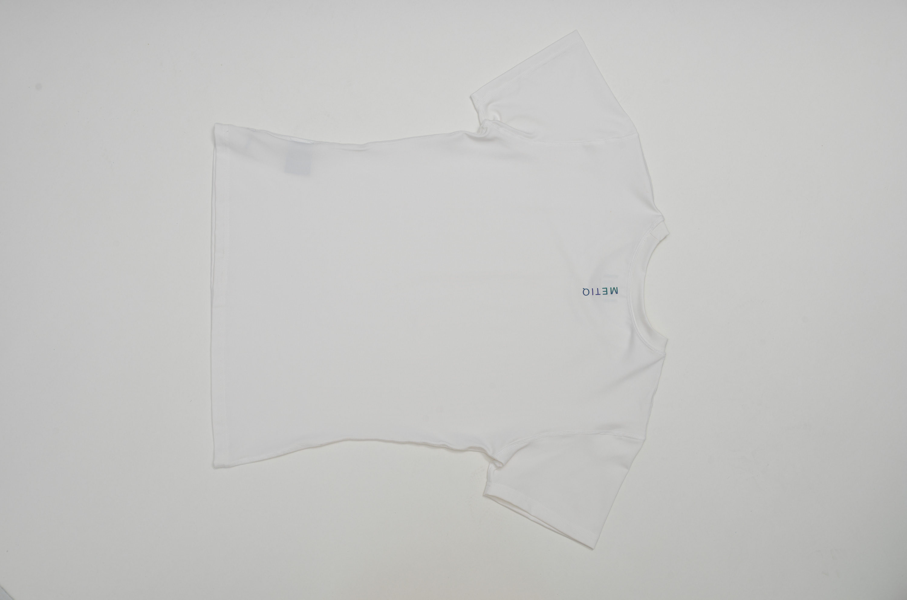 上衣背面靠近衣領正中垂直排列METIQ的字樣。